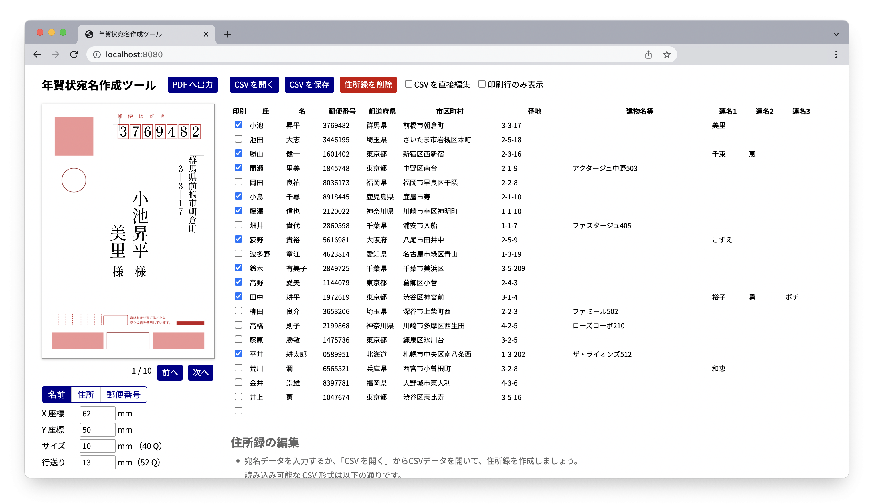 A Japanese New Year greeting card address generator with vertical text support and PDF/PNG export.